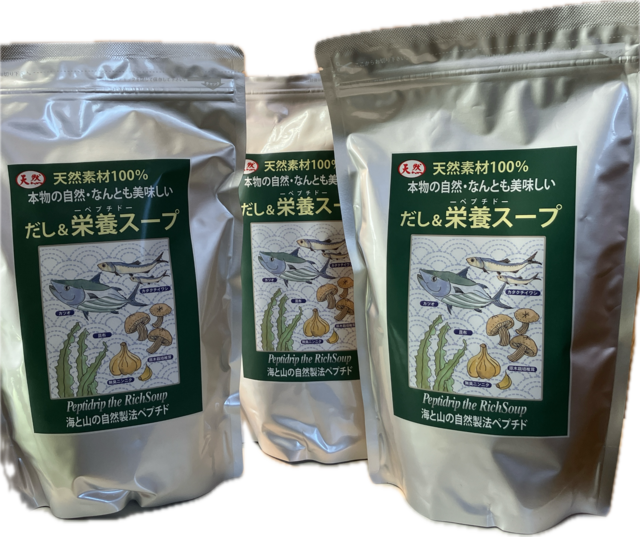 ### だし&栄養スープ3袋 ◆鉄ミネラル®️のおはなし会と同梱可能◆ 鉄ミネラル®️のおはなし会とだし&栄養スープ同梱の商品をお選びください 毎日の食卓に、自然の恵みを取り入れてみませんか? 「だし&栄養スープ」は、身体が喜ぶ栄養をしっかりと届けます。 魚肉ペプチド・魚由来カルシウム・各ミネラル 各種機能性成分 うまみ成分 100%天然素材で作られています。 特に忙しい毎日の中で、手軽に栄養を補いたい方にぴったりです。 ◆使用方法 お湯を注ぐだけで、簡単に本格的なスープを楽しめます ◆肉や魚の下味としても使えます ◆あらゆる料理のアクセントにも使え、旨みを引き出します ◆栄養価 厳選した食材から抽出された栄養素を豊富に含んでいます。 ◆赤ちゃんからお年寄りまで、消化に負担をかけずに栄養補給できます ◇おすすめ量 1人前5〜10g ◇賞味期限 製造から2年 パッケージ裏面に印字 ◇内容量 500g ◇使用期限 開封後密封容器にて約3ヶ月 ◇100g中の栄養成分 ・エネルギー 363kcal ・たんぱく質 8.1g ・脂質 0g ・炭水化物 82.0g ・糖質 81.9g ・食物繊維 0.1g ・食塩相当量 4.6g ・カルシウム 554mg ・灰分(総ミネラル) 5g ・遊離グルタミン酸 4.43g ◇内容成分 昆布 北海道 500gの製品に約650g使用 原木栽培椎茸 大分県 500gの製品に15~20個使用 無臭ニンニク 山口県 500gの製品に約30~35玉使用 片口鰯(イワシ)九州近海 500gの製品に約150匹~200匹使用 鰹(カツオ)鹿児島県近海 500gの製品に約1本使用 ◆安心も味の一つ・ペプチドリップ製法 気圧の差を利用し、世界で初めて60℃沸騰技術を実現しました。高温に弱いタンパク質の熱変性を防いでいます。 ご注文品の配送は、ご依頼を受けてから5日以内の発送となります。 週末や大型連休など、お申込み日によっては、配送まで少しお時間をいただくことがございます。 日時指定には対応ができないこともございます。 ショップ定休日:土日祝 年末年始 毎日の食事に手軽に取り入れられる「だし&栄養スープ」で、あなたの健康をサポートいたします! 体が喜ぶスープを、ぜひお試しください!